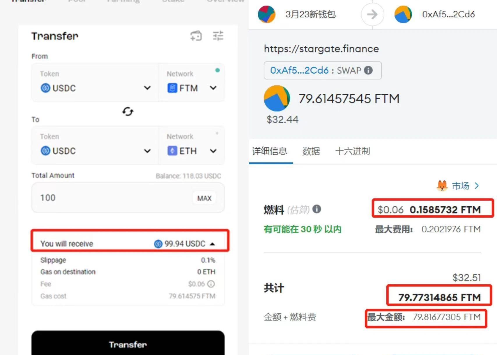 比如把?Fantom?上的?USDC?跨鏈至以太坊上,Stargate?頁面顯示收到?99.94?USDC,但是你點開收費詳情頁面就會看到,還需要另外支付?79.61?FTM?作為鏈上?gas?費,這個費用還是預估費用,在實際跨鏈中支付的金額可能會更高,如本次跨鏈最終支付的?Gas?費為?79.8?FTM,在扣除源鏈?GAS?費后,還需要再支付目標鏈?Gas,其實最終到賬金額是,實際到賬金額約?67?USDC。