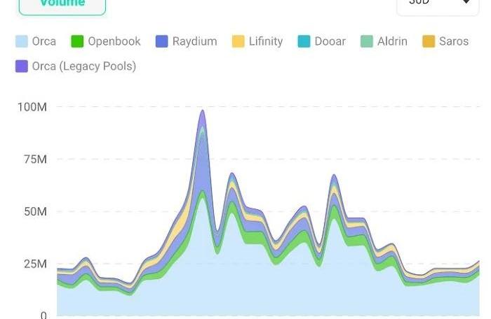 Orca已成為Solana鏈上最主要的DEX,其交易量占比已經達到74%以上,其次是OpenBook、Raydium、Lifinity和Aldrin。然而,我們仍然能在Solana鏈上看到像RootProtocol?這樣的創新項目,該項目構建了一個結合了AMM高效率和訂單簿靈活性的混合DEX。