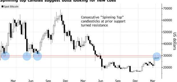 比特幣自3月以來一直徘徊在28,000美元區域附近,分析師認為,上行阻力為29,000美元至30,000美元區域,該阻力模式在技術分析中被稱為SpinningTop形態,代表猶豫不決,或多頭和空頭之間的僵局。