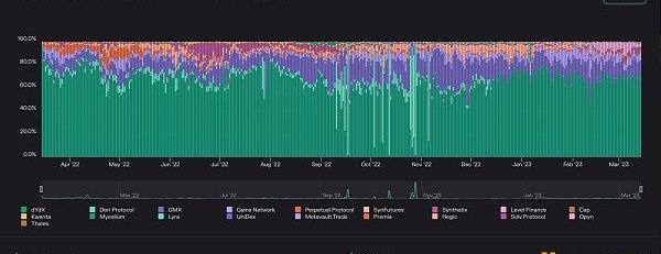 本次更新分配機制的直接原因是市場環境的變化,DYDX代幣在近一年的時間里下跌了近70%,而市場份額也面臨后起之秀們GMX追擊從一年前的95%降至目前的70%。