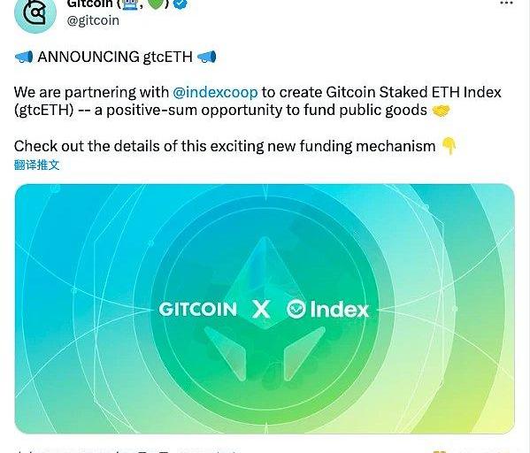 XRP/HKD-6.37%3月8日凌晨,去中心化捐贈平臺Gitcoin于官推正式公布了其與指數協議?Index?Coop聯合推出的流動性質押指數代幣?GitcoinStakedETHIndex的詳細信息,并在附帶的官網文章中公開了Index?Coop上的?gtcETH交易及鑄造前端。