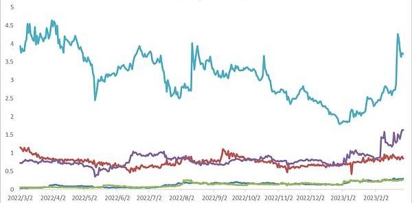 以下是四個主要LSD的30日增長率變化,數據截取的時間跨度是2023年初至今。Lido依舊強勢,幾乎沒有負增長,Stakewise的市場份額上升緩慢,一定程度上反映了老LSD協議在商業模式上缺乏亮點,在搶奪質押增量時競爭力不足。