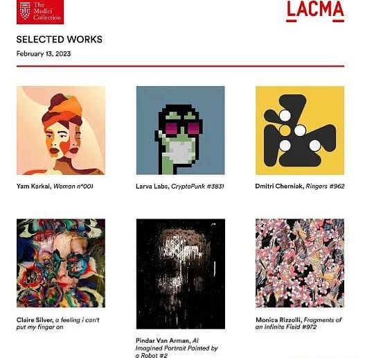 美國西部最大的藝術博物館洛杉磯縣藝術博物館(LACMA)收到了Cozomode’Medici的22件NFT藝術品作為禮物,其中包括CryptoPunks、DmitriCherniak的Ringers,以及ClaireSilver和PindarVanArman的AI藝術作品。