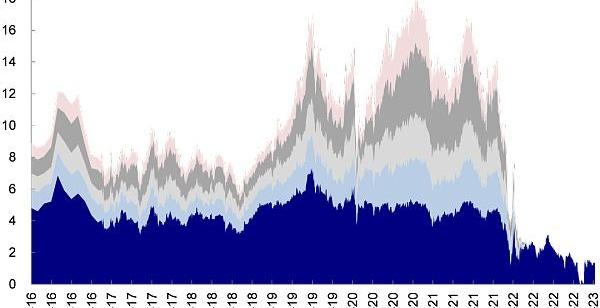 圖表:全球負利率債券從2020年底高峰的18萬億美元降至當前的1.2萬億美元,且剩下的全部是日本債券