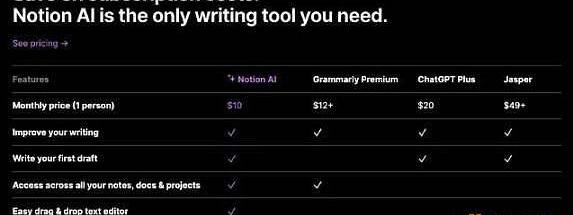 因為相較于目前市面上其他的類似AI產品,NotionAI的收費其實并不算高,比如專注于幫助用戶修改語法的Grammarly的訂閱費用就要12美元/月,ChatGPT新出的Pro版要20美元/月,一些專門的AI寫作工具月收費更是在20-50美元不等。相對便宜的服務價格,但NotionAI功能卻完全沒有打折扣,反而用戶能夠調用AI的場景更加豐富。