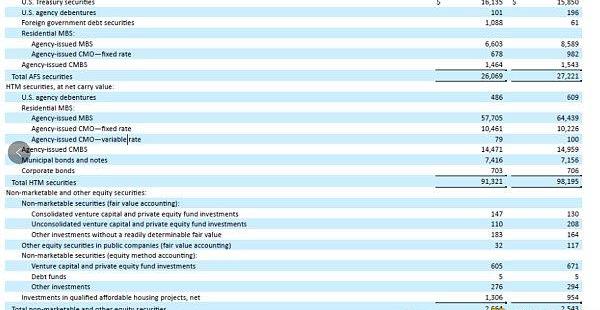 由于SVB的資產購買集中在2020-2021年低息期間,因此AFS和HTM資產的平均收益率非常低。從10-K看,其AFS的平均收益率只有1.49%,HTM的平均收益率只有1.91%。伴隨美聯儲2022年的快速加息,這些低息時期購買的AFS資產在2022年給SVB帶來了超過25億美元的未實現損失,而如果將1000億以HTM計量的MBS的未實現損失考慮進去,總的未實現損失高達175億美元。