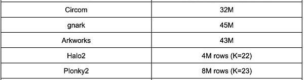 Circom、gnark、Arkworks都使用相同的R1CS算法,計算64KBSHA-256的R1CS約束數量大致在30M到45M之間。Circom、gnark和Arkworks之間的差異可能是由于配置差異造成的。