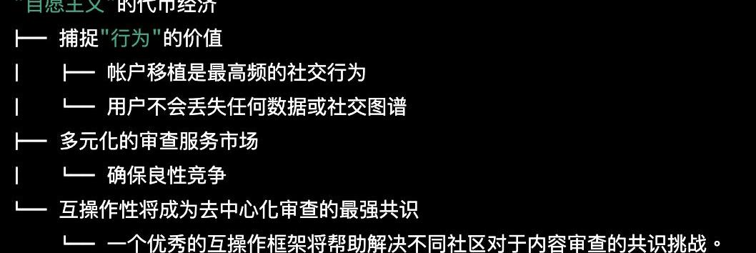 遵循“自愿主義”的代幣經濟應該更多地去捕捉“行為”的價值,而不是去捕獲“用戶”。其中,帳戶移植應該是最高頻的社交行為,用戶可以將自己的帳戶從一個項目轉移到另一個項目,而不會丟失任何數據或社交圖譜。同時,去中心化的社交協議需要一個多元化的審查服務市場,以確保良性競爭。這就是說,互操作性將成為去中心化審查的最強共識。一個優秀的互操作框架,將幫助解決不同社區對于內容審查的共識挑戰。