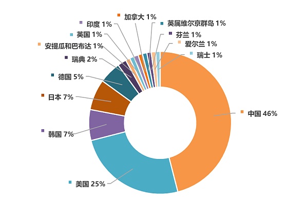 入榜前100名企業主要來自14個國家、組織或地區,中國占比46%,其次為美國占比25%,韓國和日本各占比7%,德國占比5%,瑞典占比2%,安提瓜和巴布達、英國、印度、加拿大、英屬維爾京群島、芬蘭、愛爾蘭、瑞士分別占比1%。
