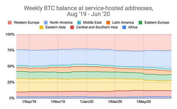 盡管截至2020年6月,基于北美的地址約占全球所有加密貨幣活動的15%,落后于西歐的17%和東亞的31%,但北美地址在加密貨幣余額方面處于領先地位。截至6月底,北美地址持有目前停放在服務托管地址的所有加密貨幣的29%,而基于東亞的地址則為16%。這些數字將表明,北美地區的用戶傾向于讓他們獲得的加密貨幣放在錢包里積累,而東亞地區的用戶則傾向于更頻繁地交易這些貨幣。