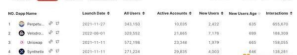 在Optimism推出Token經濟激勵后,按照目前l2beats的統計,目前Optimism的TVL達到Arbitrum的57%,發展迅猛。此外,其生態項目也開始逐步發展起來。比如SNX和Perp已經將其重心從以太坊L1遷移至Optimism,還有一些原生的項目,如velodrome等也逐步有了一些用戶。