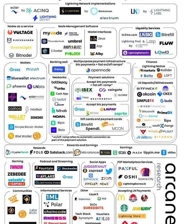 目前,閃電網絡的生態發展得已經相當豐富,包括閃電網絡節點和流動性服務、錢包支付應用、以及游戲、社交網絡、零售場景等等。