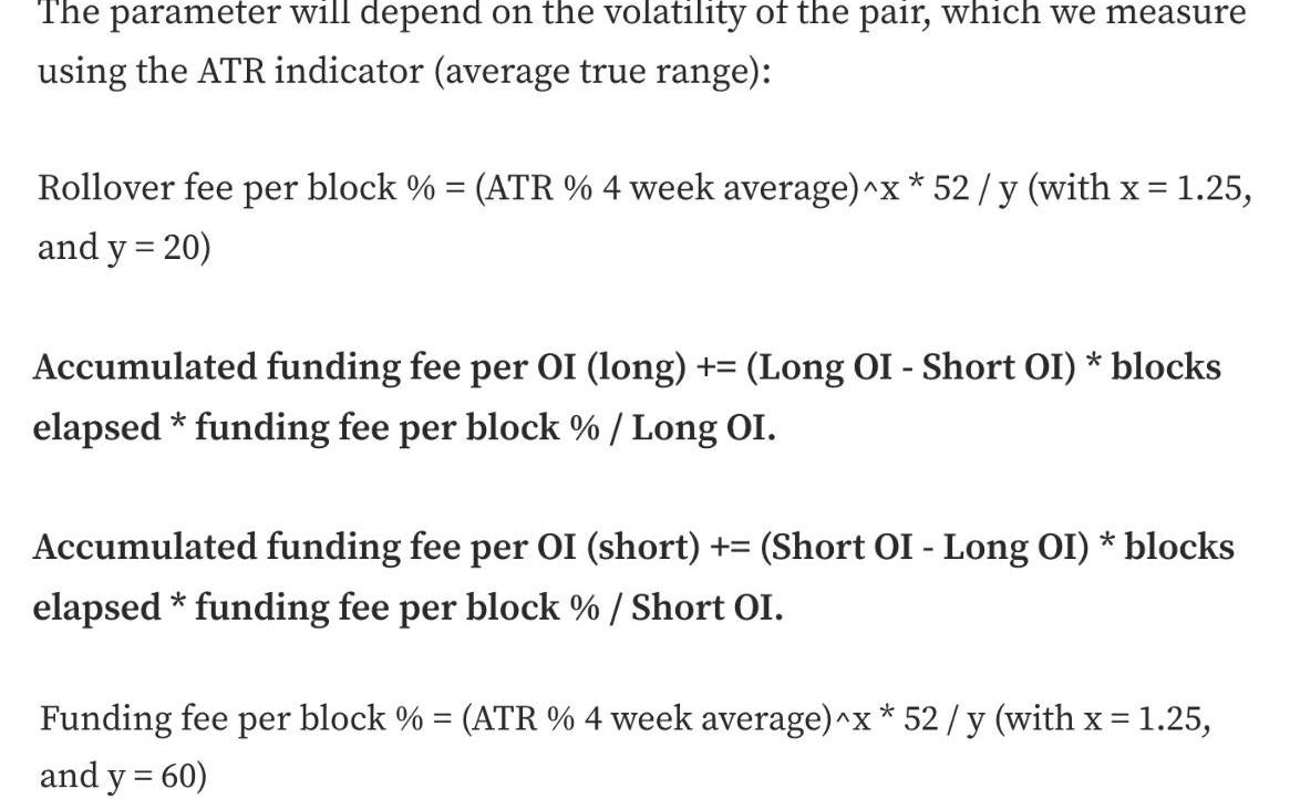 RolloverFee/FundingFee根據近期波動性計算,RolloverFee多空均要繳納,而FungFee則由多空比例決定由一方支付給另一方,具體公式參見下圖。在狂暴大牛市下,波動性和多空比的加大將會讓多方支付的費用快速上漲,以此回補作為對手方的損失以及控制多空比。當然,這些也造成了其不菲的交易成本,所以在加密貨幣這種可以做IndexAssetLP的資產類別上,體量會遜于GMX。而對于股票/外匯這種沒有鏈上資產的類別,其就極具優勢。