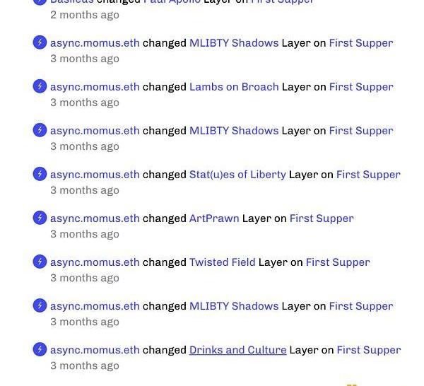 這幅《FirstSupper》由13位加密藝術家聯合創作完成,共包含22個Layer.當其中一個Layer發生變化時這幅畫也將發生變化。其中Master和各Layer都可以被單獨的進行交易。