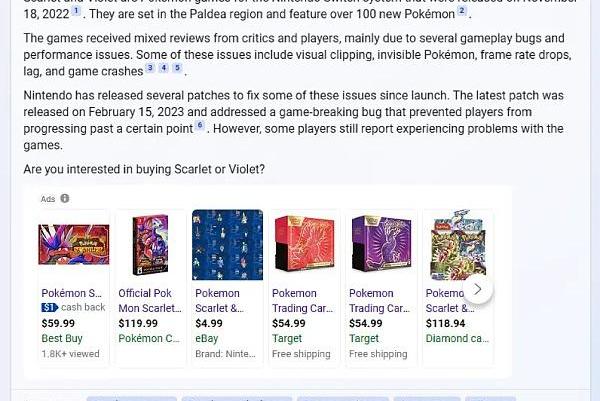 來自Reddit的一份帖子顯示,新必應在回復結果呈現頁面中會給出一些跟搜索內容相關的產品廣告,如用戶搜索《寶可夢》相關問題時,新必應會給出相關商品的廣告鏈接。