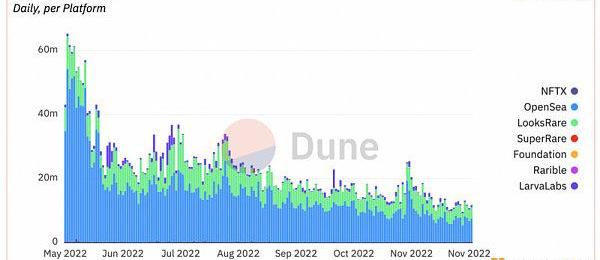 NFTFI?的誕生與?NFT?息息相關。NFT?市場從?2021?年?2?月開始受到關注,再到?8?月推到高潮,?22?年?1?月到達了頂峰,Opensea?當月交易額達到?48?億美元。但是隨著整個加密市場開始拐頭向下運行,NFT?市場也不可避免受到波及,交易量和交易額開始快速下跌,經歷了一個從暴漲到暴跌的過程。