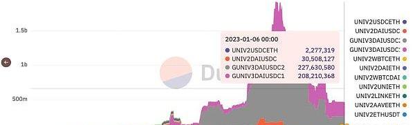 此外,UniswapTVL是杠桿化的:在34億美元中,約4.35億美元來自DAI/USDC交易對,MakerDAO已將該交易對杠桿增加至50倍,因為它接受UniDAI/USDCLP代幣作為抵押品,以鑄造DAI!DAI隨后可以重新存入以獲得LP代幣,鑄造更多DAI!