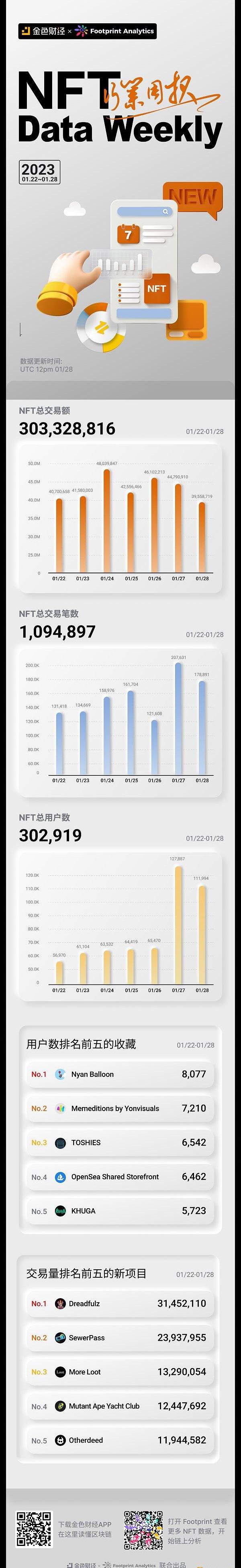 4、上周用戶數排名前五的收藏:NyanBalloon、MemeditionsbyYonvisuals、TOSHIES、OpenSea、KHUGA