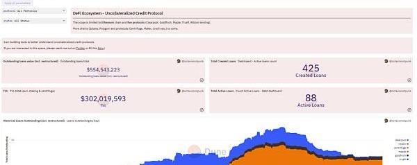 各種DApp有不同的用途;在研究項目時,沒有一種放之四海而皆準的方法來衡量需求。但是,使用像DuneAnalytics這樣的免費數據資源可以幫助投資者關注DApp行業特有的特定指標。例如,如果有人想查看以太坊上無抵押信用協議市場的總規模,他們可以在Dune.com上搜索“無抵押信用協議”,并找到各種儀表板來跟蹤各種無抵押信用協議指標,比如創造的貸款總額、主動貸款等