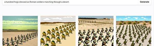 例如,我們輸入文本“一百只打扮成羅馬士兵的青蛙在沙漠中行進”。即使我們嘗試了多種提示變體,結果也不盡如人意。