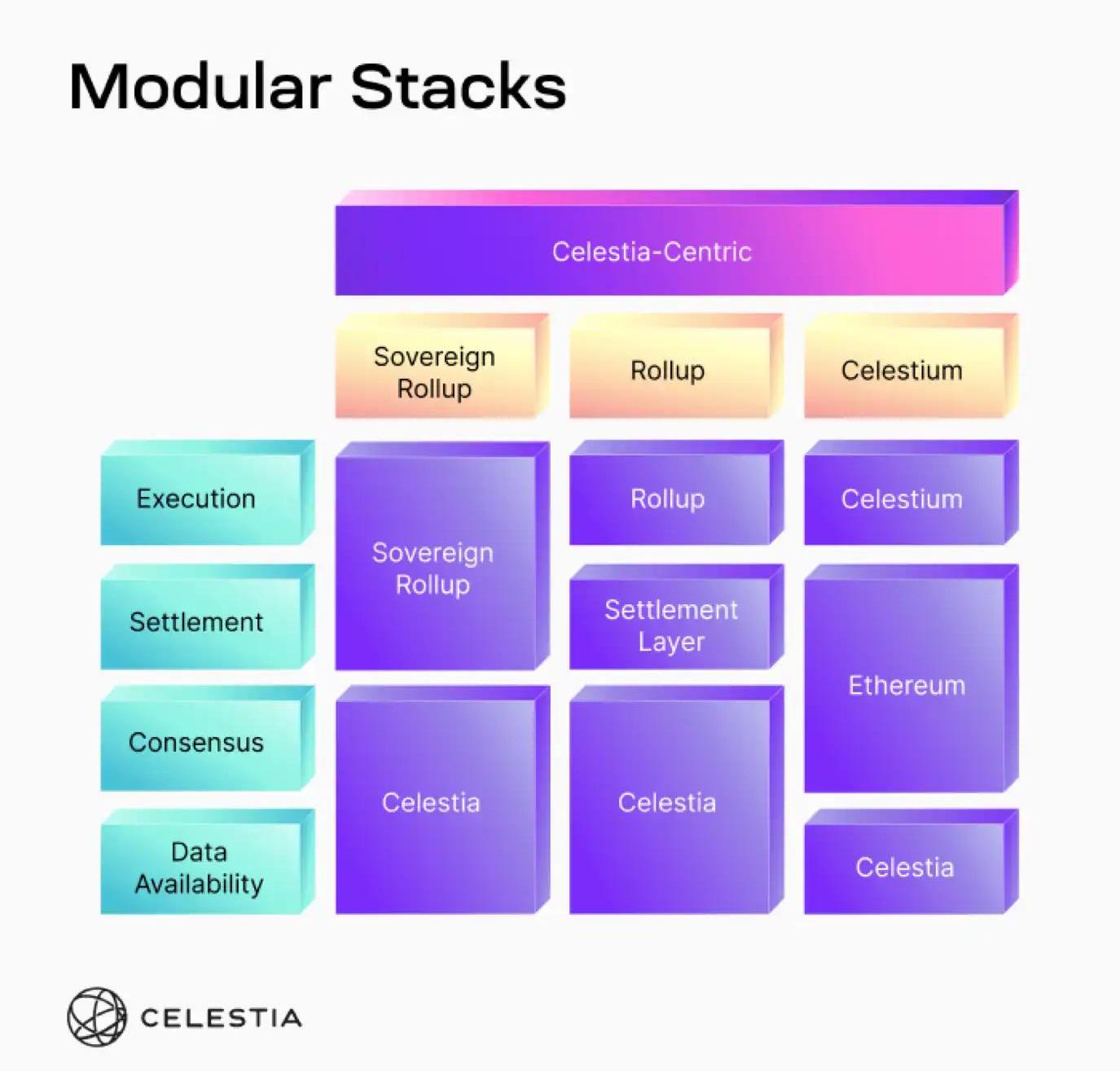 Celestia是一個模塊化區塊鏈網絡,區塊鏈和所有VM的Rollup可以使用Celestia作為數據可用性層和共識層,如下圖,Celestia為模塊化擴展提供了不同的解決方案,如「Sovereignrollups、Celestium等」。