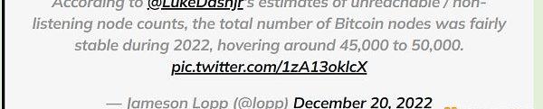 2022年比特幣節點數量保持穩定。我想說,這是由專心致志的運營者組成的一個非常強大的運營商,無論匯率如何,我們將繼續為我們的自身利益運行節點。