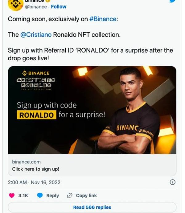 此外,C羅在2022年也與加密交易所Binance進行了合作,并在Binance的NFT市場上推出自己的NFT系列。