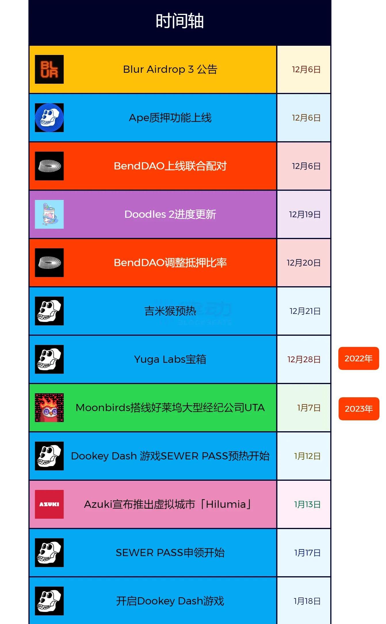 經過一年跌宕起伏的發展,Azuki始終維持在頂級藍籌的梯隊,按照上文Blur、BendDAO、YugaLabs的時間線推進,在2023年的1月12日將會迎來Azuki的周年慶。