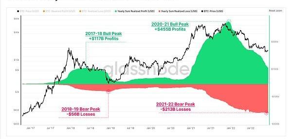 2020-21年寬松貨幣政策時代的流動性過剩泡沫,創造了鏈上年度實現利潤總額的記錄。比特幣投資者在鏈上轉移資金時,每年獲利超過4550億美元,在2021年11月的ATH后不久就達到了峰值。