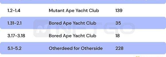 2022年5月1日是巨鯨群體今年的交易最活躍的時間,在這一天巨鯨進行了頻繁的買入賣出交易,買入70909493美元的NFT資產,其中包括了25439910美元的OtherdeedforOtherside,除此之外還有YugaLabs系列共計46148230美元的NFT組合,包括BoredApeYachtClub、MutantApeYachtClub、Meebits、Doodles、BoredapeKennelClub、CryptoPunks等NFT。