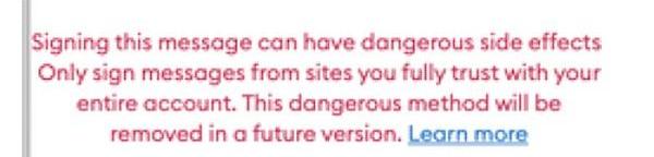 這是一種非常危險的簽名類型,基本上是以太坊的“空白支票”。請求者可以用它來簽署任何帶有你私鑰的交易。好消息是,如果被請求,Metamask會顯示一個大的紅色警告。它有效地允許某人,如果他們正確地制作簽名有效載荷,能夠為了他們自己的利益“重放”交易,例如向自己發送ETH。這不像被盜的wETH、NFT和其他代幣那樣依賴于批準。這是唯一存在這種風險的簽名類型,因為很少有服務合法使用它,通常應不惜一切代價避免!