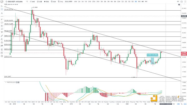 金色分析師K神表示,周線突破頸線3.12美金,將會雙底形態迎來強漲行情,下一中期目標位4.2美金上方,上周末價格出現變盤突破,直線拉升至最高3.95美金附近再回落,走勢相當強勢,領漲其余主流幣,技術圖形上,最高接近周線下降壓制線附近,這個區域存在一定的空頭阻力,并且近期大幅上拉,價格已經偏離短期日均線和周均線都較遠,短期內繼續向上突破的難度較大,需要一段時間的震蕩蓄勢才有繼續上破的機會,前期2.8-2.85區間低吸入場的可繼續持有,未入場的可在3.4-3.5區間低吸,這個位置消磨后繼續向上突破壓制線的概率大。