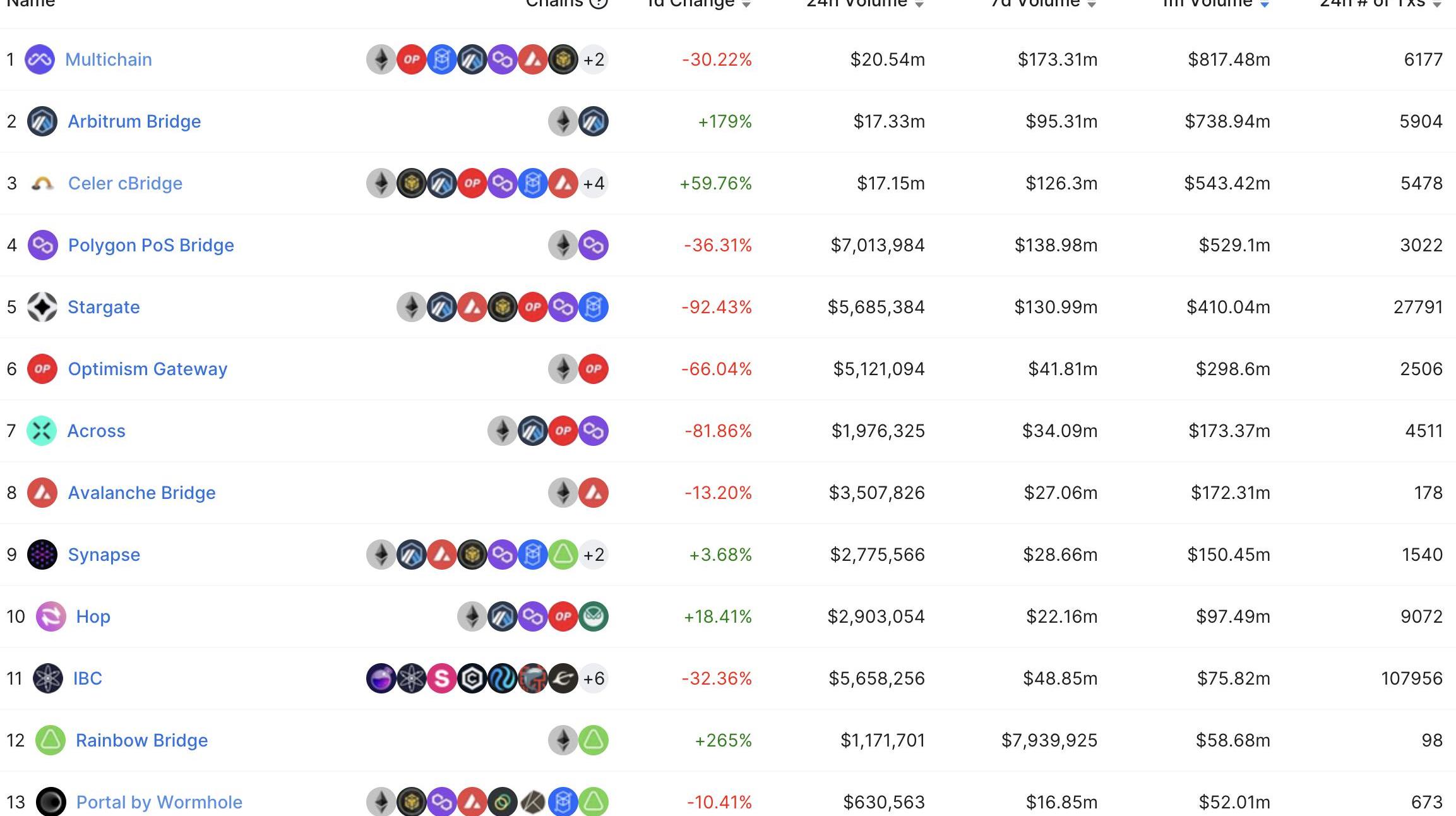 跨鏈橋:Multichain流動性和交易量均位列第一,Wormhole的TVL最高下降94.6%