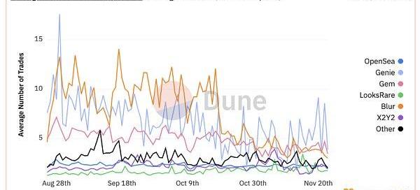 雖然Gem和Genie上的交易量有所減少,但另一個聚合器-Blur?上的交易量卻出現了回升。當然現在判斷Blur是否開創了成功的聚合器模式還為時過早。