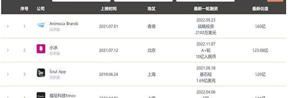 根據報告,2022年中國元宇宙企業有四只獨角獸,其中AnimaocaBrands估值60億美元,成為當前中國估值最高的元宇宙公司,小冰估值23.08億美元為估值第二高,上海的Soul和魔琺科技分別估值為20億美元和11億美元。