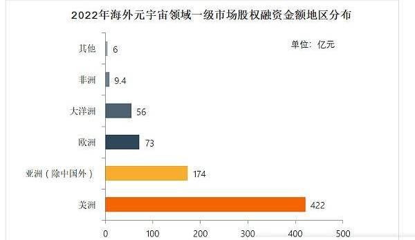 發生在美洲的元宇宙融資總額為422.34億元,占比達57%;發生在亞洲的元宇宙融資總額為173.6億元,占比達23%;發生在歐洲的元宇宙融資總額為73.49億元,占比為10%;發生在大洋洲的元宇宙融資總額為55.77億元,占比達8%;非洲為9.49億元,占比達1%。
