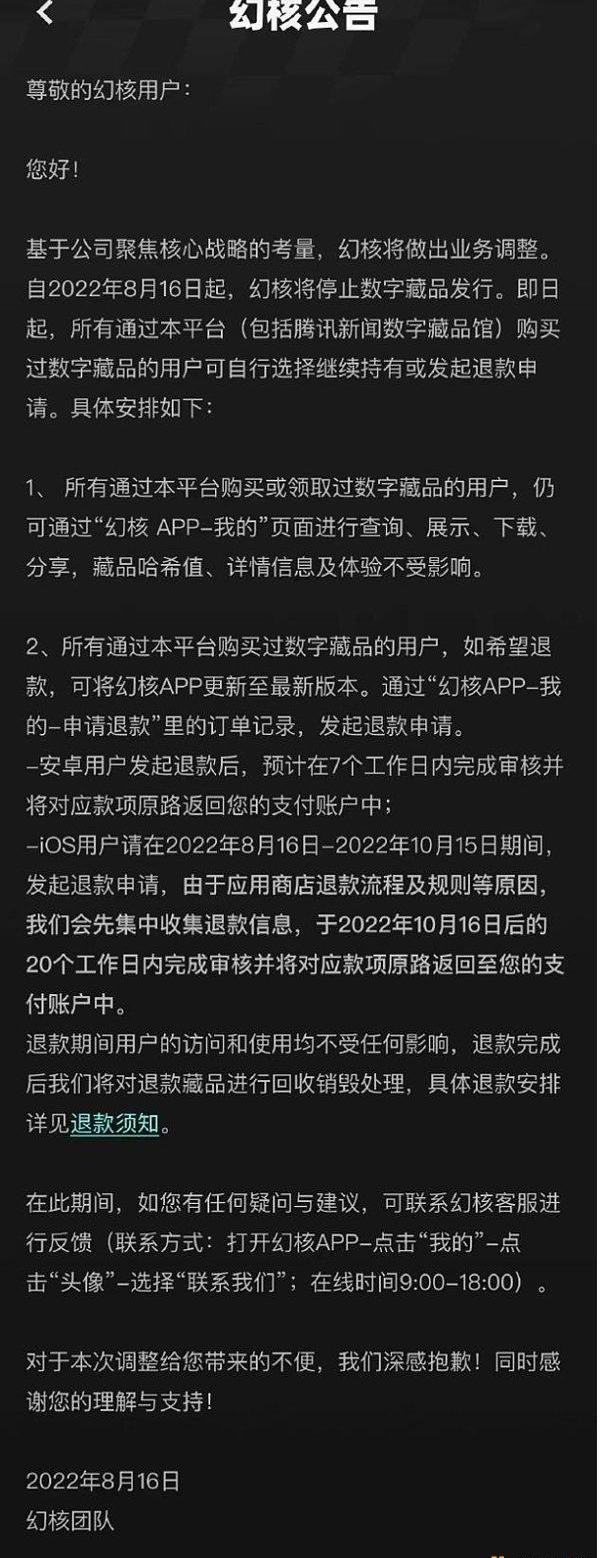 8月16日,曾經國內最大的數藏平臺幻核正式宣布停售數字藏品,這個背靠騰訊,坐擁眾多IP,不缺資金支持的數藏平臺,上線不到一年便宣布關停。
