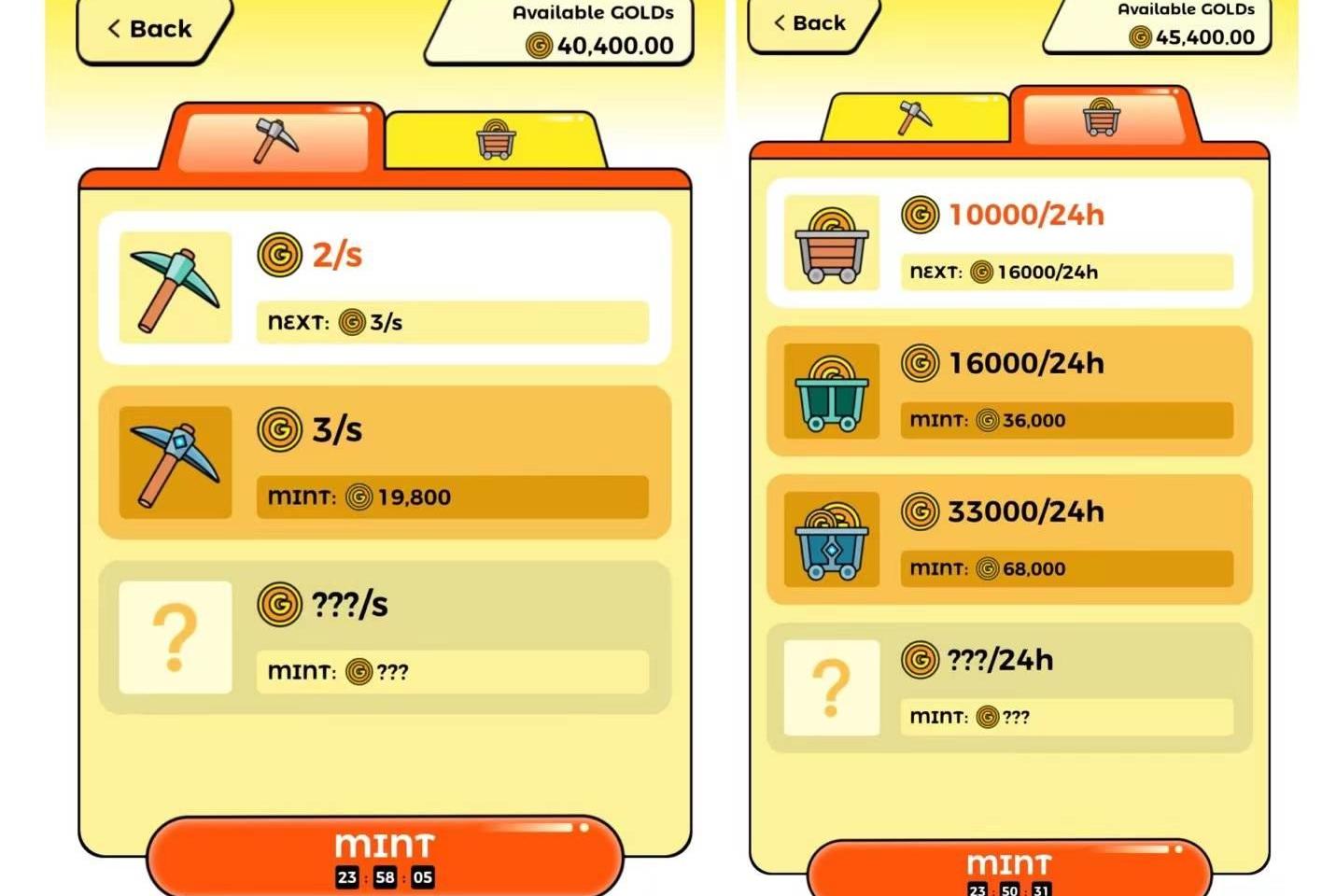 應用默認的挖礦效率為每秒挖出1枚Gold,挖礦時間為1h,單賬號上限為每24h產出10000枚Gold。用戶可通過點擊Tap按鈕來提升挖礦效率,也可以鑄造挖礦效率更高的鋤頭。2HGT/s效率的鋤頭鑄造價格為9600枚Gold,3/s效率的鋤頭鑄造價格為19800枚Gold。同時可以提升礦車容量來提升每日可挖礦數量,16000/24h礦車鑄造價格為36000枚Gold,33000/24h礦車鑄造價格為68000枚Gold。