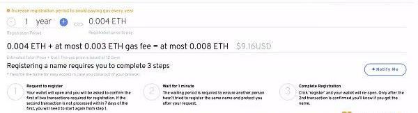 用戶在官網中,將要注冊的域名等注冊信息傳給控制器合約,控制器合約通過預言機計算該域名的價格,同時將域名通過namehash轉成node后傳給基礎注冊器進行域名NFT的注冊,同時將域名相關注冊表信息寫入注冊表合約完成注冊,同時域名的owner可以在官網通過注冊表合約進行管理操作,官網中的注冊頁面如下: