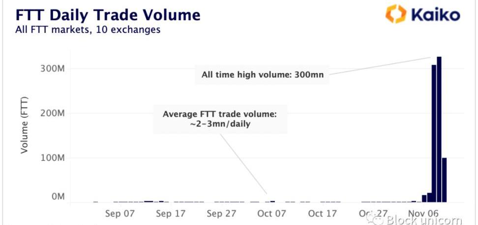到周二結束時,FTT交易量已飆升至歷史新高,單日交易量高達3億FTT。周三,Binance向所有交易者發出警告,由于極端的風險,停止所有FTT的購買和銷售,此后交易量已經穩定下來。