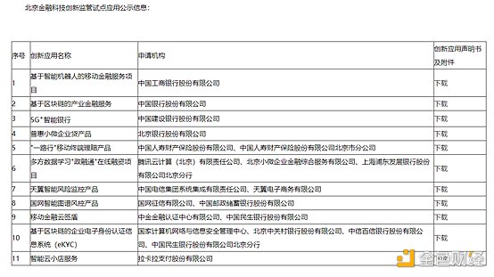 根據公示內容,該11個應用分別為:基于智能機器人的移動金融服務項目(工商銀行)、基于區塊鏈的產業金融服務(中國銀行)、5G+智能銀行(建設銀行)、普惠小微企業貸產品(北京銀行)、“一路行”移動終端理賠產品(中國人壽/中國人壽北京分公司)、多方數據學習“政融通”在線融資項目(騰訊云計算/北京小微企業金融綜合服務有限公司/浦發銀行北京分行)、天翼智能風險監控產品(中國電信/翼支付)、國網智能圖譜風控產品(國網征信/郵政銀行)、移動金融云簽盾(中金金融認證中心/民生銀行)、基于區塊鏈的企業電子身份認證信息系統(國家計算機網絡與信息安全管理中心、中關村銀行、百信銀行、民生銀行北京分行)、智能云小店服務(拉卡拉支付)。