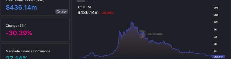 DeFiLlama數據顯示,截至發文Solana鏈上鎖定的資產總價值約為4.36億美元,24小時縮水幅度高達30.39%,甚至要超過SOL本身的跌幅。距離巔峰期101.7億美元的數據已縮水逾95%。