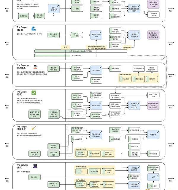 該路線的主要目標是推動以Rollup為中心的擴容。Surge指的是添加了以太坊分片,這是一種擴容解決方案,?以太坊基金會聲稱:該解決方案將進一步啟用低gas費的二層區塊鏈,降低rollup或捆綁交易的成本,并使用戶更容易操作保護以太坊網絡的節點。