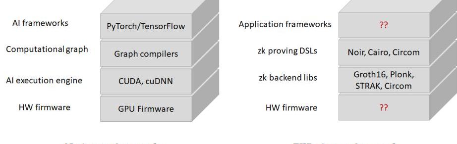 今天的ZKP狀態類似于早期的AI狀態,這是一項有前途的技術,仍在積極開發中,并且因計算密集型特性而導致證明時間很長。從AI的進步軌跡中學習,我們可以確定ZKP技術起飛需要解決的瓶頸。