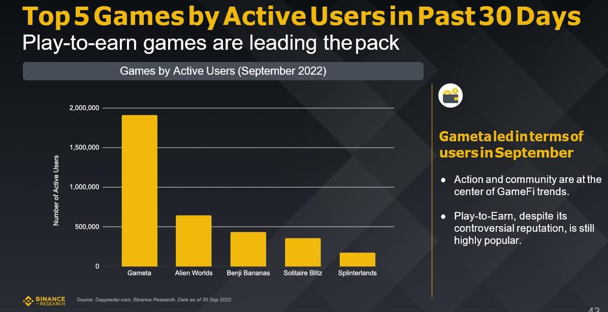根據截至2022年9月30日Dappradar.com和BinanceResearch的數據顯示,“邊玩邊賺”P2E游戲正在引領潮流。