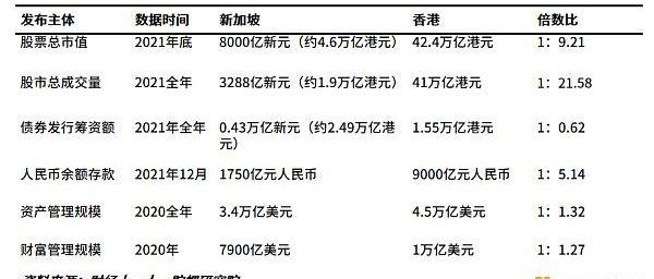 但在傳統金融領域,由于背靠中國內地這一龐大市場,無論是股票、債券或是資管,香港在市值、交易額等方向均優于新加坡。2021年底香港股市總市值為42.4萬億港元,新加坡股市總市值8000億新元,折算匯率后香港股票總市值為新加坡的9倍有余。