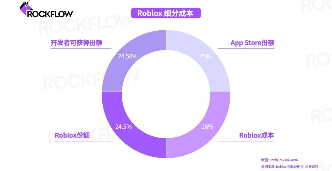 作為UGC平臺,Roblox的盈利離不開玩家的Robux充值。根據公司公告,目前所有用戶充值主要分為應用商店費用、開發者份額、平臺維護成本、Roblox份額四部分,其中開發者激勵占據24.5%。
