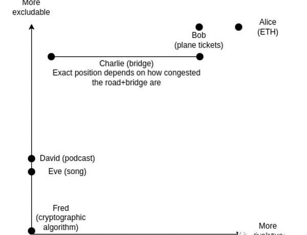 鮑勃的機票是排他性的,但競爭性要小一些:飛機有可能不會滿員。查理的橋比普通票的排他性要低一些,因為添加一個入口來驗證通行費的支付需要額外的努力,競爭性取決于道路擁擠程度。