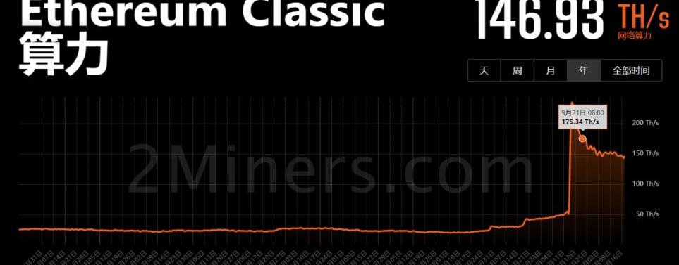 簡介:以太坊經典,因為TheDAO黑客事件分叉而出的公鏈,這也是以太坊社區最大的一次分裂,ETC雖然繼承以太坊最初的極客精神,但在后續發展中逐步落伍,生態發展也無法與現ETH和其他L1相抗衡。從下圖的算力增長情況可以看出,在以太坊合并前三天,巨量的算力開始涌入,從最初的55.67TH/S上升到234.35TH/S,增長了近四倍,是以太坊算力遷徙的最主要目的地。