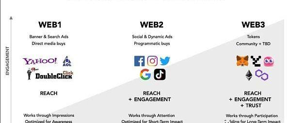 因此,當我們從營銷人員的角度來看待web1、web2和web3時,它不僅僅是一個從"閱讀"到"讀/寫"再到"讀/寫/擁有"的功能擴展。Web3代表了一種從短期到長期的根本性戰略調整,這種調整是通過更高的價值參與來實現的。更具體地說,Web3是一個從"到達"到"到達+參與"再到"到達+參與+信任"的演變。